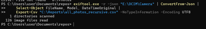 > $reportData | Export-Csv -Path "C:\Reports\photo_exif.csv" -NoTypeInformation -Encoding UTF8