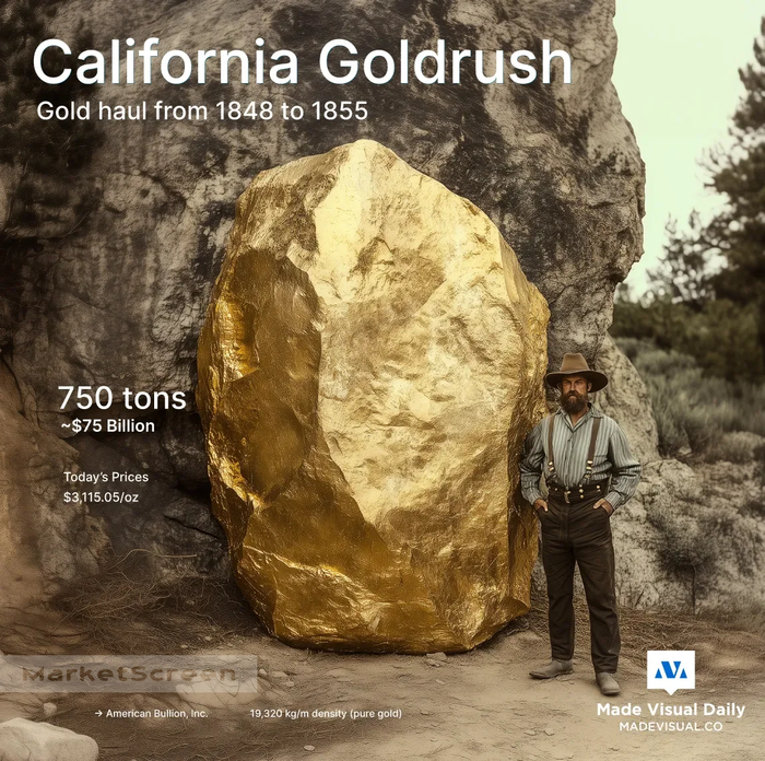 В период с 1848 по 1855 год в Калифорнии было добыто около 750 тонн золота стоимостью более 75 млрд $ по сегодняшним ценам (3 115,05 $ за унцию).