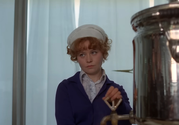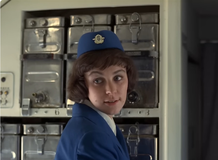 Стюардесса - симпатяжка Катюша, ненароком обидевшая Валико напоминанием об "открывалке", впервые появилась в кино годом ранее, ярко блеснув в роли Белки в культовом в своё время мюзикле "Мама" (1976). Потом будут роли в "Четвёртой высоте", "Опасно для жизни!", "Следствие ведут ЗнаТоКи", "Московской саге", "Тяжёлом песке" и много работы на ТВ.