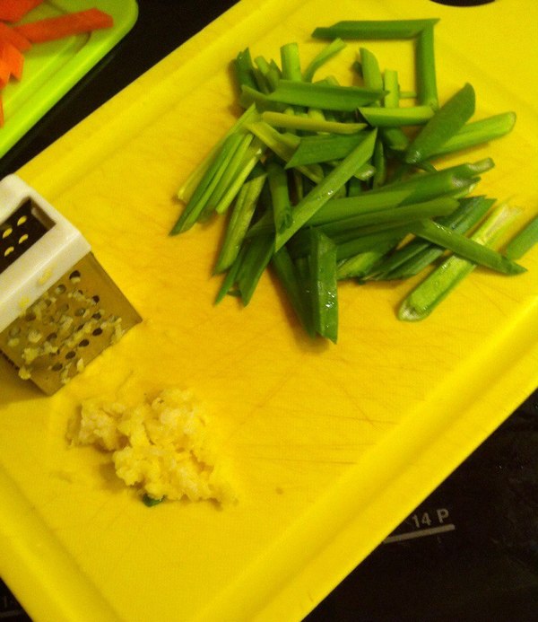 5) Подготовим топпинги для супа. Зеленый лук порезать перышками, обычный лук порезать максимально тонкими полукольцами, прям вообще нанометрическими, имбирь порезать соломкой. У зелени отрезать ножки (чтобы не убежала ха-ха! Простите...), лайм порезать на дольки (я видел, что его еще кружочками нарезают, но мне кажется удобнее его в суп выжимать, когда он дольками), проросоль помыть, перчик чили порезать перышками и залить уксусом, мне кажется так практичнее будет. Если просто добавить чили в суп он не так равномерно отдаст остроту, просто будет попадаться в супе и выжигать рецепторы, а после уксуса он сделает суп равномерно остреньким и не будет так сильно жечь попав в пасть. Ну и не забудьте рисовую лапшу подготовить, она обычно как Доширак заваривается, т.е залили кипятком на 3 минуты, кинули на дуршлаг, промыли холодной водой. и Да, в момент нарезки овощей и зелени и при готовящемся бульоне запахи на кухне просто обалдеть, закройте дверь, чтобы соседи не приперлись.