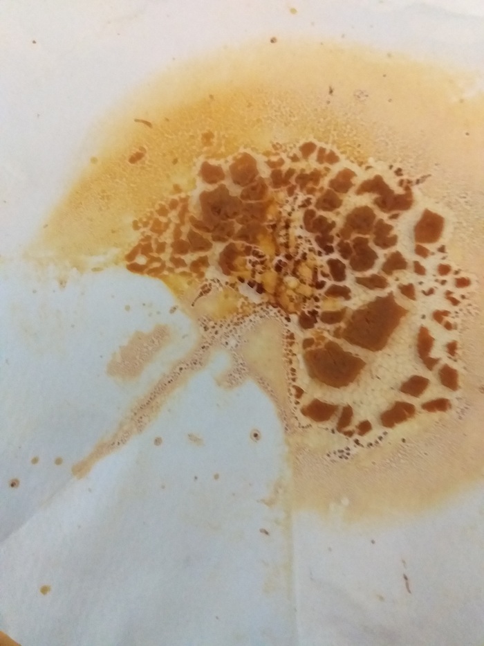 Это фильтры с металлическими включениями выделившимися в процессе данной работы. Вверху фильтр который хотел выбросить, слева фильтр с губчатым металлом (в водном растворе данный металл выглядел как порошок, если раствор помешать), справа фильтр после лимонной кислоты.
