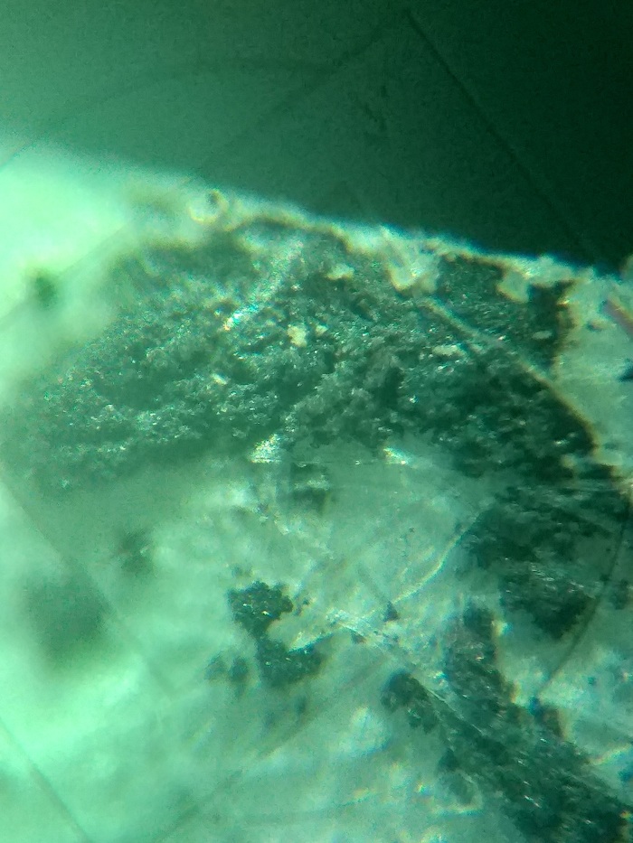 А тем временем бура в мензурке растаяла и все, что было в ложке, в которой я пытался расплавить желтый осадок, перешло в раствор лимонной кислоты. Лимонная кислота была слита, осадок промыт водой, просушен и просмотрен под микроскопом. Осадок состоял из порошка буроватого, коричневатого цвета и многочисленные металлические включения белого зеркального цвета.