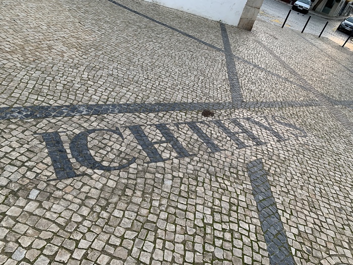 И вот мы идем по улице Фару с Альберто, хозяином гестхауса (стати, рекомендую). Он показывает различные места, рестораны, объясняет что здесь да как. В один момент я вижу вот такую надпись плиткой около церкви «ICHTYS».