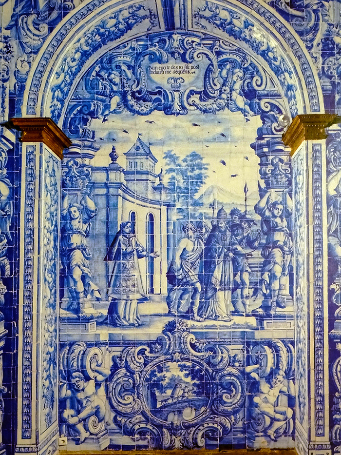 Подходим к храму. Снаружи — типичная однонефная барочная церковь. Построена в конце 17 века. Над входом - плитка азулежу, очень похожая на наш гжель.