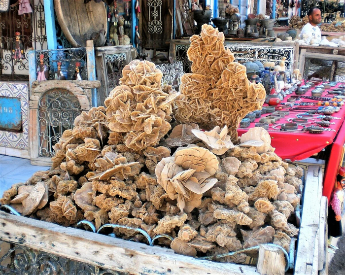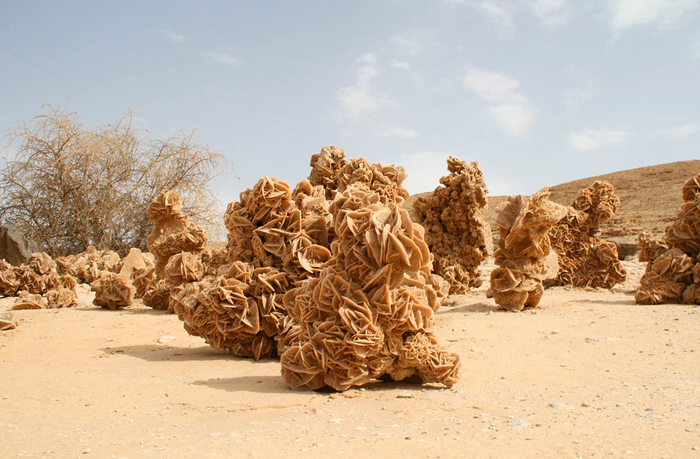 «Роза пустыни» (или «роза песков») — разговорное название, обозначающее одну из морфологических разновидностей минерала гипс. Минеральные агрегаты образуют характерные сростки линзовидных кристаллов (розеток), внешне напоминающие цветок розы. Еще бедуины-кочевники заметили, что в пустыне нередко встречаются причудливые образования, чаще всего напоминающие цветы. И соотнесли их происхождение с тем, что на этом месте... опорожнялся верблюд. Но ученые установили, что дело тут вовсе не в моче. Главное сырье — песок. Он должен быть особым, насыщенным гипсом. Чтобы цветок «вырос», должен пройти столь редкий в пустыне дождь. Он пропитает песок и склеит между собой частицы гипса. Когда снова установится жара, вода начнет испаряться и капли, поднимаясь, будут образовывать гипсовые кристаллы скрученной формы.