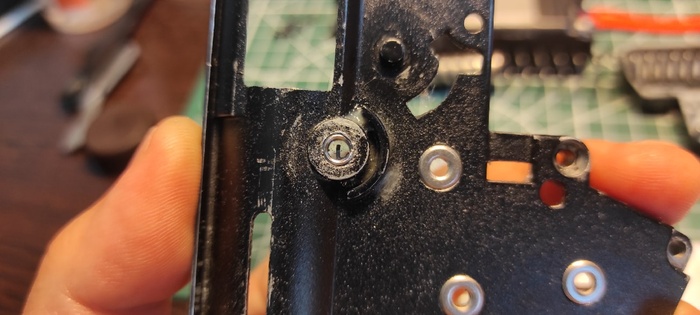 Как это выглядит изнутри. Видны следы удаления заусенцев надфилем. В моем случае я фиксировал втулку эпоксидным клеем изнутри гирбокса. Кстати втулки шестерен так же зафиксированы эпоксидным клеем.