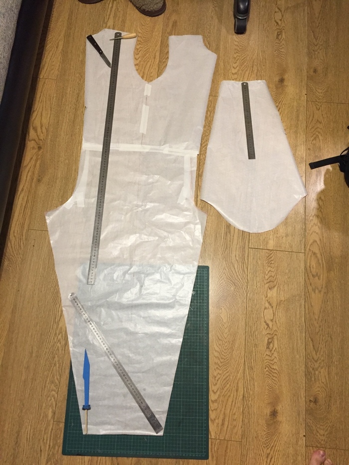 После сьют был разрезан и на основе разрезанного была сделана выкройка. Для переноса выкройки в цифровую форму для всех последующих работ она была разложена поверх раскроенного коврики с сантиметровой сеткой и сфотографирована.
