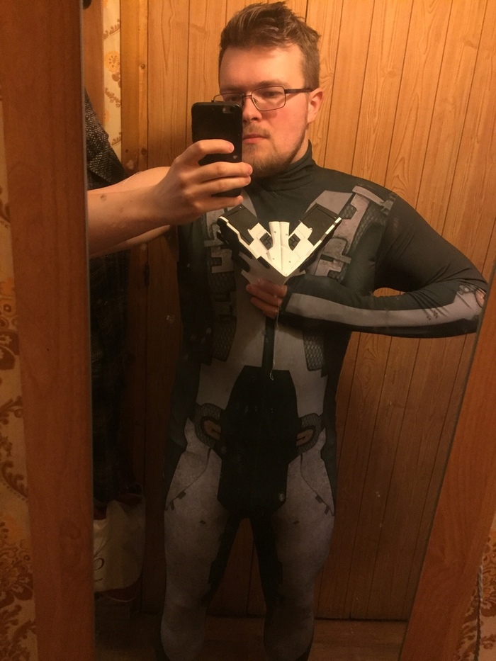 После следующей проверки была установлена молния на спине (закрываемая спинным модулем), и сьют был окончательно сшит с использованием тянущегося варианта шва и добавлены липучки для приклепления кусков брони на костюм.