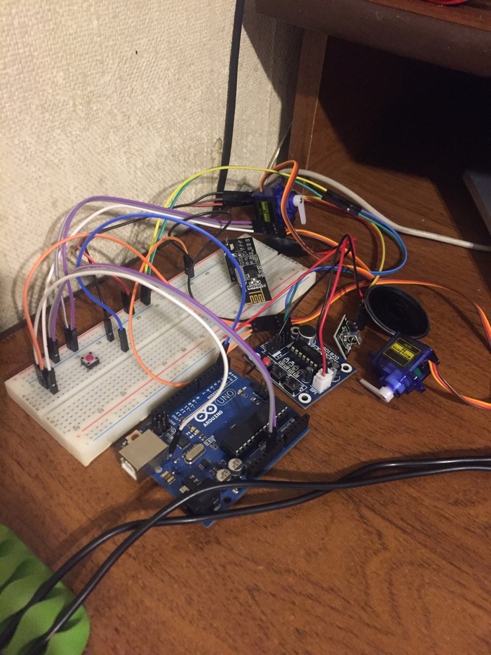 Использовалось два сервопривода, Arduino Nano, IR приемник и также управляемая светодиодная лента для подсветки.