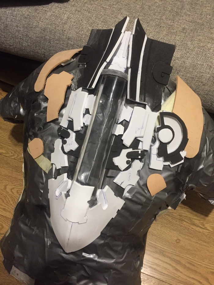 Для спинной и фронтальной брони использовались шаблоны созданные на основе 3d моделей. В качестве материалов использовалась ЕВА, кожа и прозрачный ПЭТ пластик для светящихся элементов.