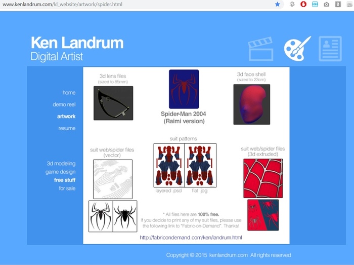 По мере изучения вариантов изготовления шаблона для сьюта и вариантов выкроек я набрел на материал одного из зарубежных сайтов по печати на ткани — https://fabricondemand.com/ken/landrum.html и оттуда попал на http://www.kenlandrum.com/kl_website/artwork/spider.html где были представлены бесплатные шаблоны для печати и изготовления сьюта для человека-паука.