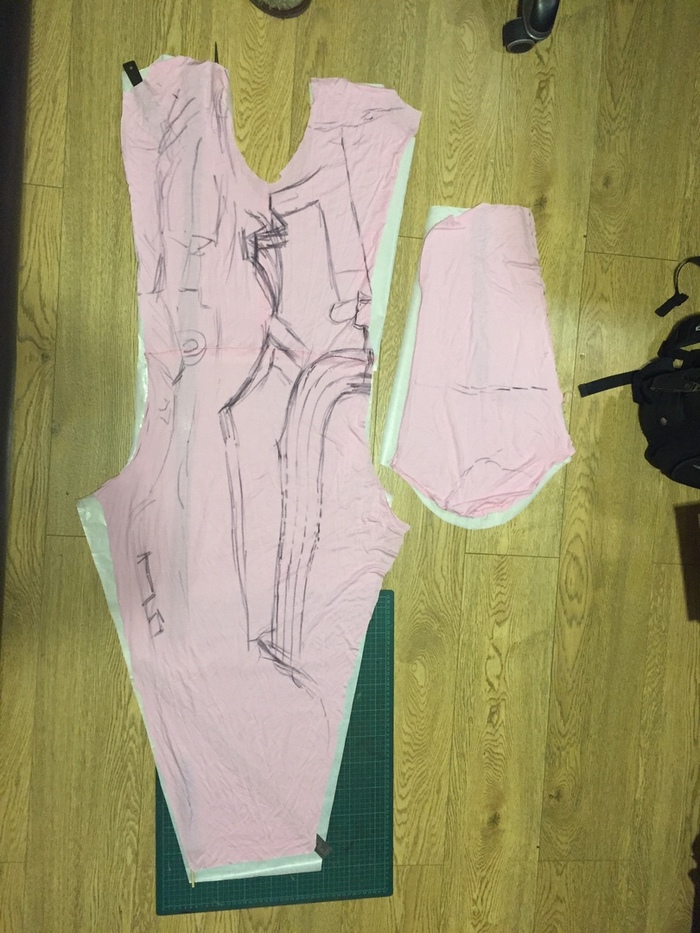 Далее из дешёвой ткани был изготовлен прототип сьюта, на котором был примерно нарисован узор оригинала – что требовалось для облегчения соотношения узора в игре и на текстуре и проекции его на ткань.