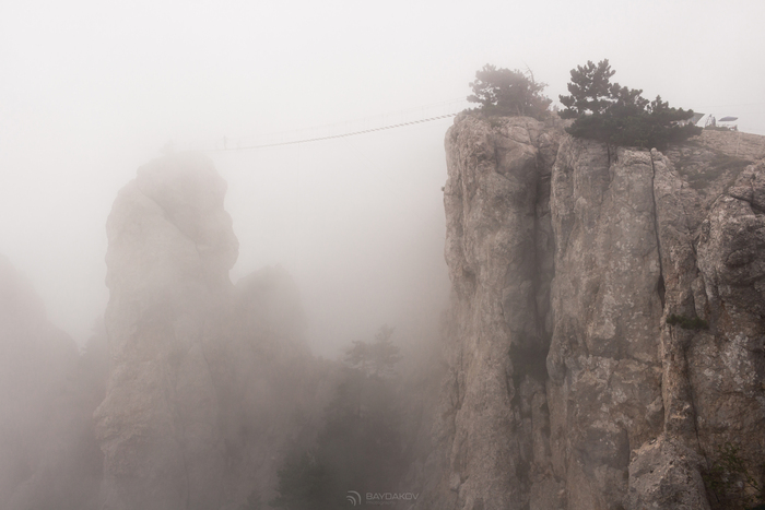 На следующий день мы прошли по Таракташской тропе, через каньон похожий на каньоны дикого запада. К вечеру поднялись на плато. Тут нас ждала цивилизация, татарские угощения и развлечения. Зубья вершины Ай-Петри соединяет деревянный мостик. Высота под мостом 1234 метра.