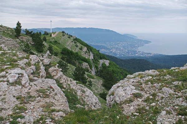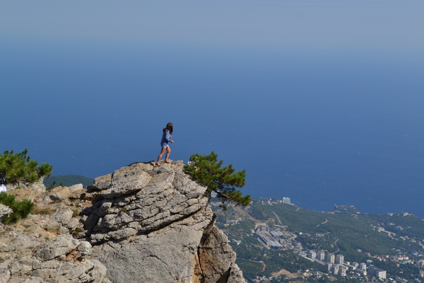 Уже не помню во сколько, могу только сказать – через несколько часов – мы подошли к селу Охотничьему с его многочисленными кафе, куда нас зазывали, искушая всяческой едой. Мы не искусились, понимая, что внизу можно будет нормально поесть раза в два дешевле, прошли мимо и направились к краю плато, дабы узреть раскинувшуюся внизу Ялту и пригороды.