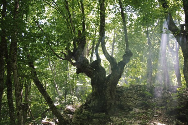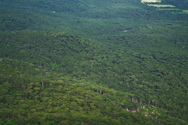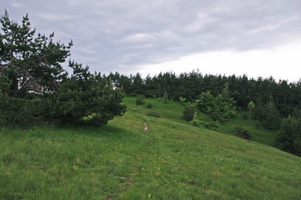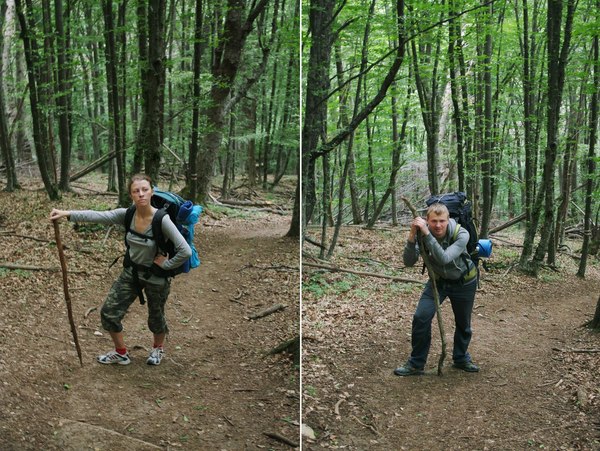 Потом же разогнаться нам не давала уже сама тропа – хоть она и была относительно пологой (ну, относительно, например, подъема на Мангуп), но все равно упорно шла все вверх и вверх. И мы брели по ней неспешно, как навьюченные ослики, иногда делая небольшие привалы и спрашивая П. «а далеко еще до вершины?», на что он как правило никаких конкретных сведений не давал. Сама же тропа упорно делала вид, что вот еще немножко – и вот там лес уже посветлее, и подъем вроде более пологий. Но каждый раз это оказывалось иллюзией, и за каким-нибудь поворотом тропа вновь предлагала нам поднапрячься.