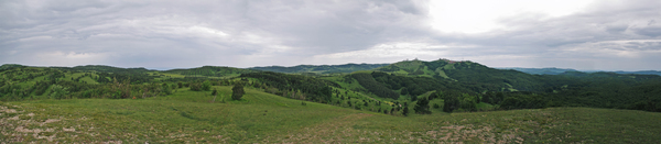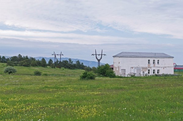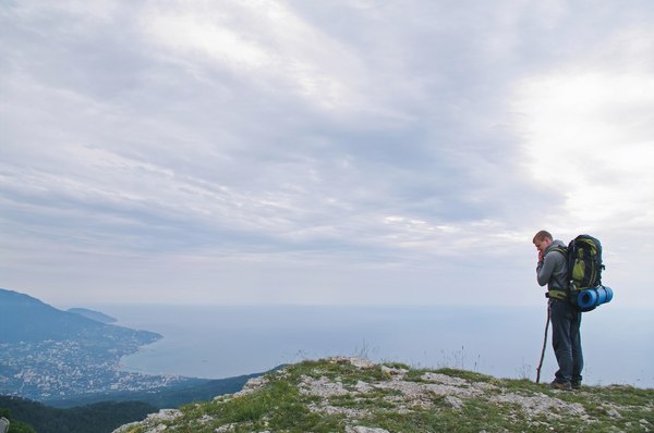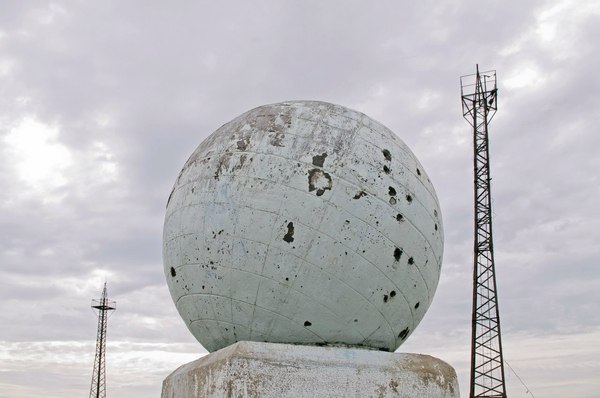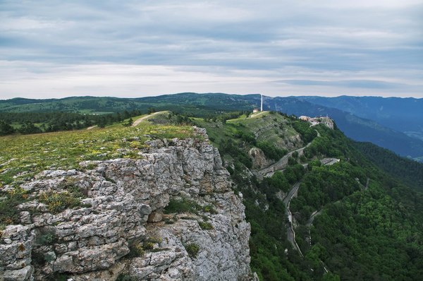 Однако в какой-то момент мы, наконец, вышли куда-то наверх и узрели указатель, который информировал о том, что начала тропы - вот оно, а налево как раз идет дорога на Ай-Петри. Где-то неподалеку даже жужжали моторчиками квадрациклы. И в этот же момент начался тот самый дождь, который был обещан синоптиками. Поэтому мы устроили небольшой привал с поеданием сникерсов и упаковыванием себя в дождевики. Ансамбль наш получился отличный, желто-красно-зеленый. И вот мы такие красивые двинулись дальше, а дождь возьми да перестань буквально через двести метров. Нам же лучше, конечно, без дождя идти все же приятнее. Дождевики снова спрятали, а тут уже и подъем совсем закончился – пришли на вершину горы Лысая (их таких много в Крыму, эта - между горой Рока и Перепелиной горой). Ее высота – около 1250 метров над уровнем моря, которое с нее виднеется вдали. Еще видно шары-купола, которые многие принимают за обсерваторию, но на самом деле это военный объект - радиопрозрачные укрытия крымского радиотехнического батальона.
