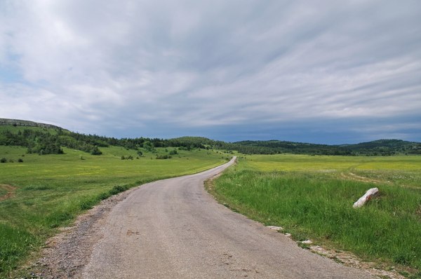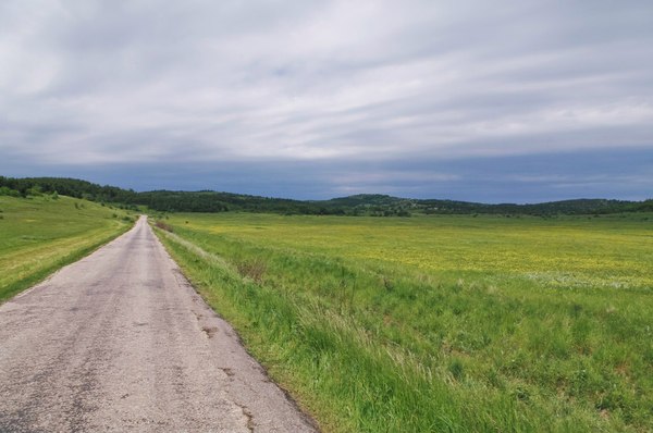 Когда мы вышли к трассе, на небе начали появляться просветы, заметно потеплело. И дальше мы уже просто шли и шли до упора, в процессе созерцая раскинувшиеся вокруг холмы и поля. Крайне редко по трассе проезжали машины, еще реже - квадроциклы. От этого "обилия" транспорта одинокая зебра среди поля выглядела несколько потерянно и сюрно.