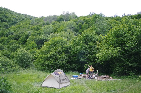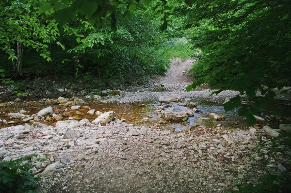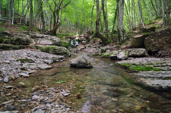 В этой части рассказа будет поменьше текста и побольше картинок, потому что она была самой медитативно-созерцательной и состояла в основном из ходьбы. Утро, не смотря на странные ночные ветры и молнии, было довольно солнечным, вот только прогноз упорно обещал дожди. Хотелось бы потусить в горах подольше, побродить еще по горам и еще разок переночевать в палатке, но еда подходила к концу, да и изначальный наш план состоял в том, чтобы сегодня вечером быть уже в Симеизе, поглощая всяческие яства в местных трактирах и отмокая в теплом душе. Посему мы не стали задерживаться на стоянке, а бодро двинулись в дальнейший путь. Вначале не разгонялись сильно, остановились набрать воды и немного пофотать живописную речушку с мохнатыми камнями.