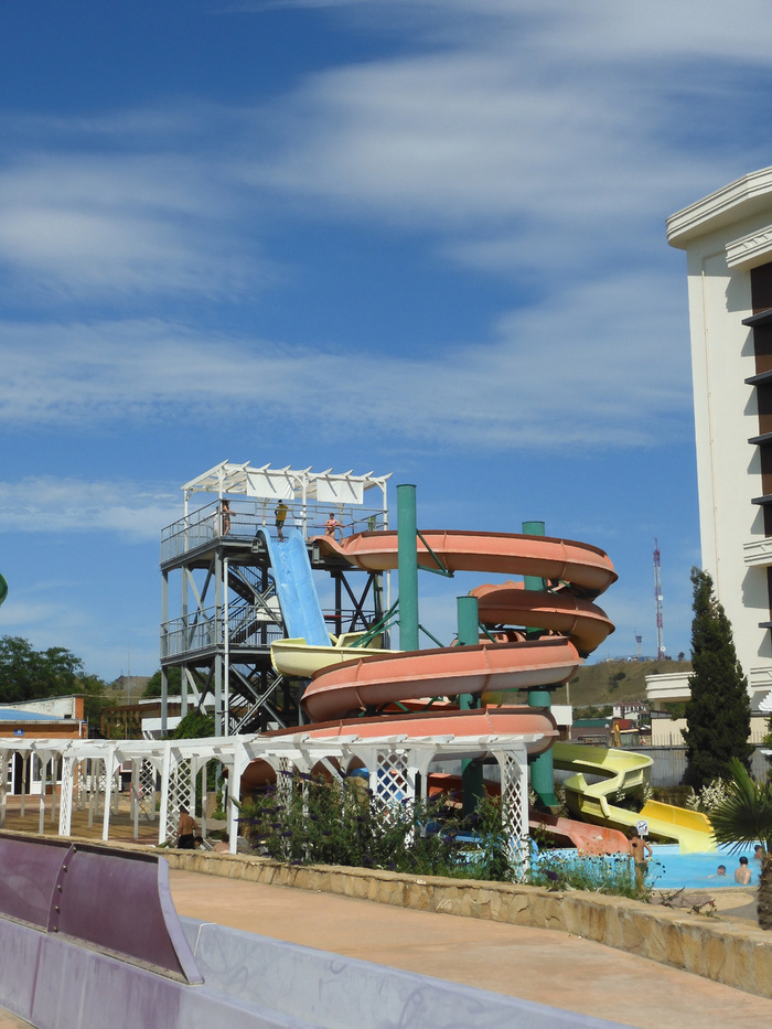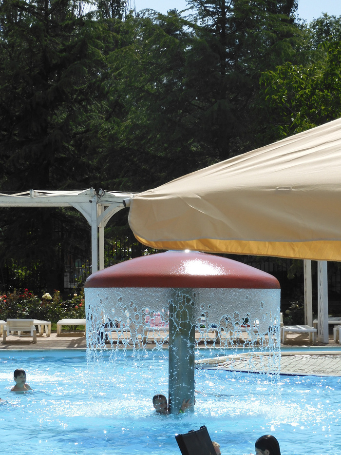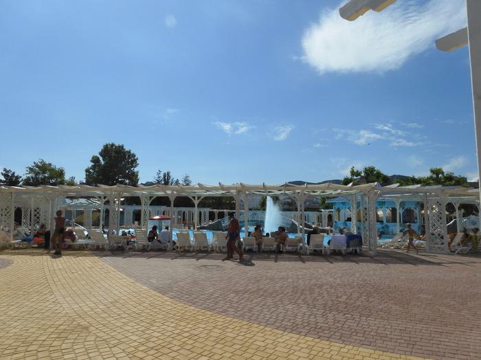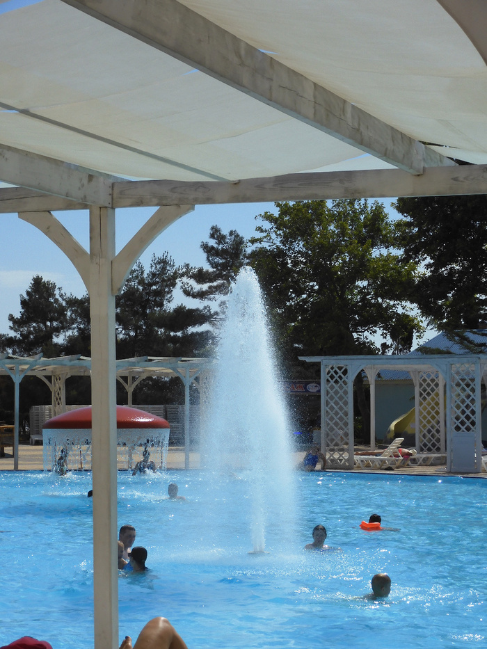 Бассейн. Большой бассейн, где проводят различные конкурсы и водное поло. По краю течёт река с противотоком. В самом бассейне есть бурлящие гейзеры, джакузи, "Каскады". Не советую проплывать под мостиком, вид вас может шокировать. А вот пройтись по нему и сделать шикарные фотографии, стоит.