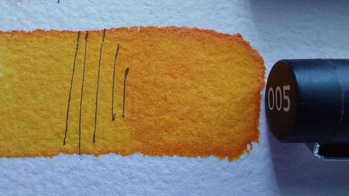 Тонкие линеры царапают бумагу, более толстые лучше справляются с задачей. На практике слоев в работе обычно больше, чем один, и линером работать трудно: кончик постоянно забивается волокнами и краской и его приходится чистить на черновике.