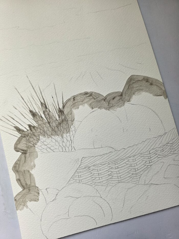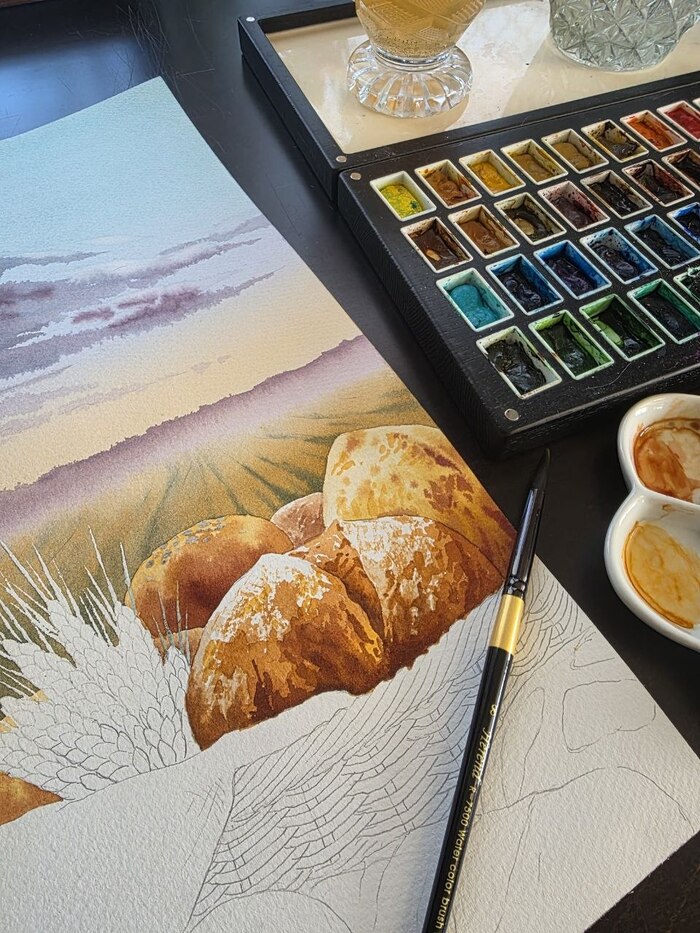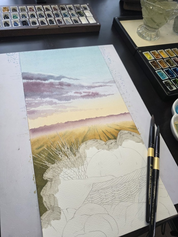 Фон писала по мокрой бумаге в один прием - бумага смочена с двух сторон. После высыхания бумаги сняла маскирующую жидкость. На днях буду дописывать передний план с хлебушками и колосками и конечно поделюсь с вами тем, что получится (но фрагментами).