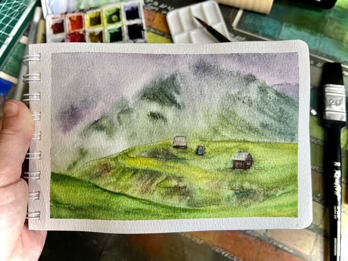 Продолжаю серию северных акварельных пейзажей неким туманным норвежским видом. Это почти наверняка именно Норвегия, но где именно — выяснить не удалось.