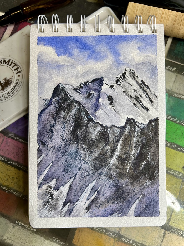 Этот год у меня не рисовальный, но октябрьские художественные вайбы невозможно не уловить и я вписалась в милый духу челлендж. Всего десять заданий, вместо тридцати одного, зато любимая тема - горы. Первые три работы тяжело шли, но я стараюсь. Сменила формат и тип бумаги, стало повеселее, а может разрисовываюсь.