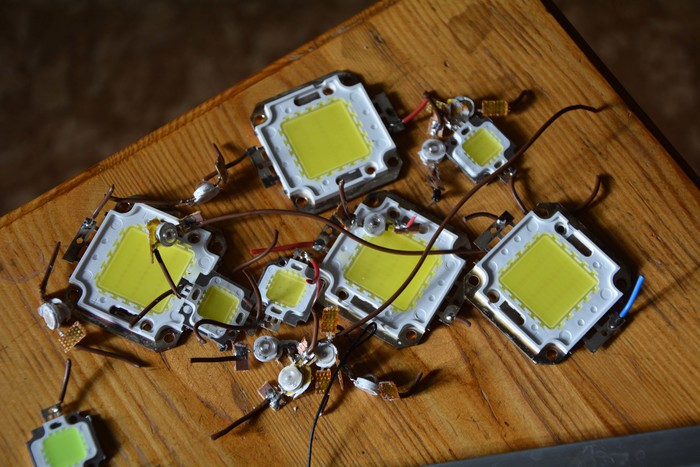 Что мы тут имеем? Древние китайские светодиодные матрицы и одиночные диоды с пластиковой оптикой. Их термическое сопротивление унылое. Кпд ниже чем у люминесцентных ламп. Спектр рваный с большим количеством провалов.
