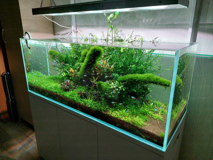 Аквариум возрастной, но прежний хозяин за ним усердно ухаживал, сделал под него тумбу на заказ, обновил отъехавший родной свет и герметик.