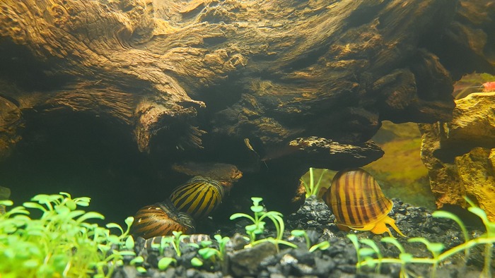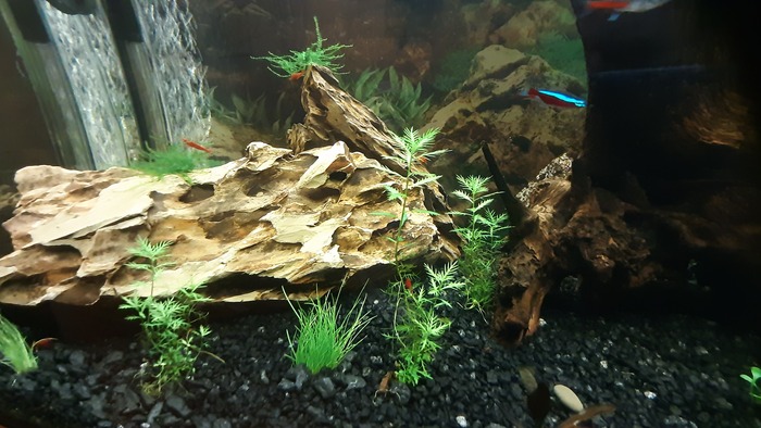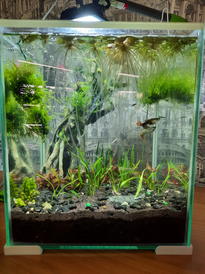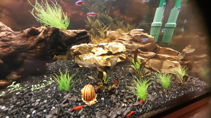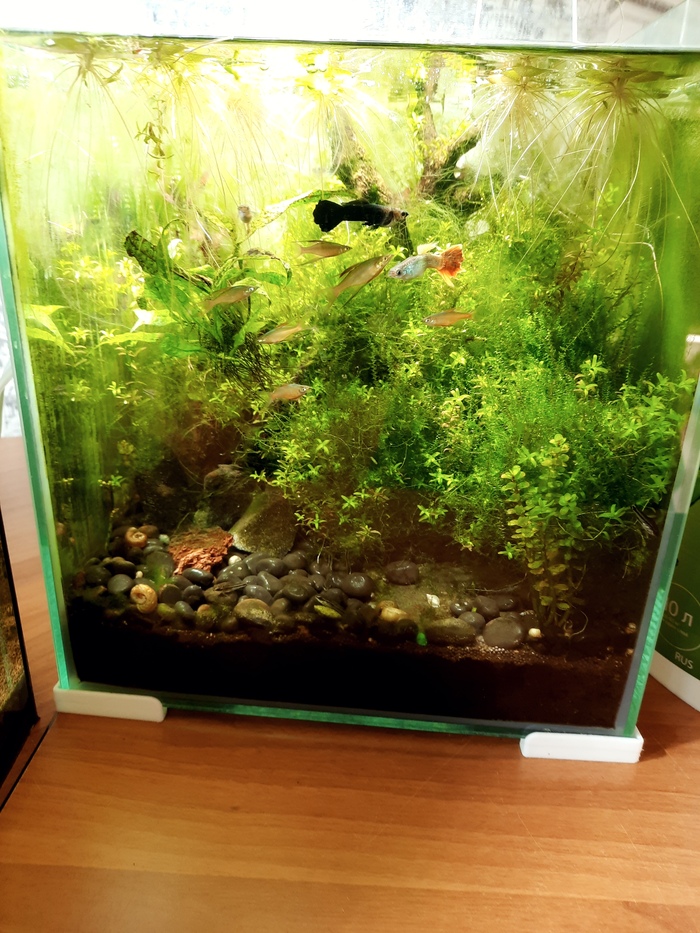 Живность - гуппи 6 взрослых и 6 мальков, иреатерины Вернера 6, коридорасы пигмеи 6 (ну прям какая-то дьявольщина), отоцинклюс 2, тетраодонт 1, креветка Амано 1, креветки неокаридины ~15, улитки физы, катушки и мелании