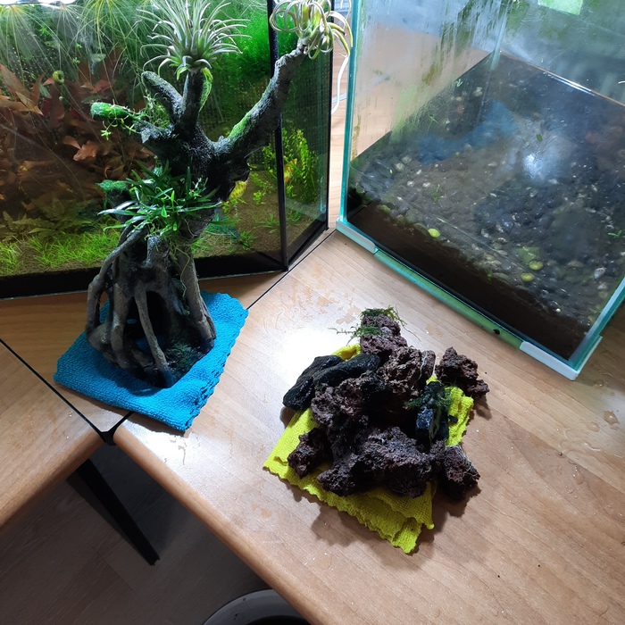В приготовленную заранее воду отсадил всю живность. Часть сразу переместил в другие аквариумы. Растения и декор замочил (о как жёстко) в лимонной кислоте 50г/15л. Мох на 10 мин. Всё остальное на 40 мин.