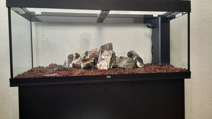 Я конечно не Такаши Амано, но хотелось чтобы выглядело прилично, даже заморочился, чтобы прожилки были паралельны и по возможности совпадали рисунком. Кстати, под водой серые камни приобретают насыщенный антрацитовый оттенок, очень добротно смотрятся.
