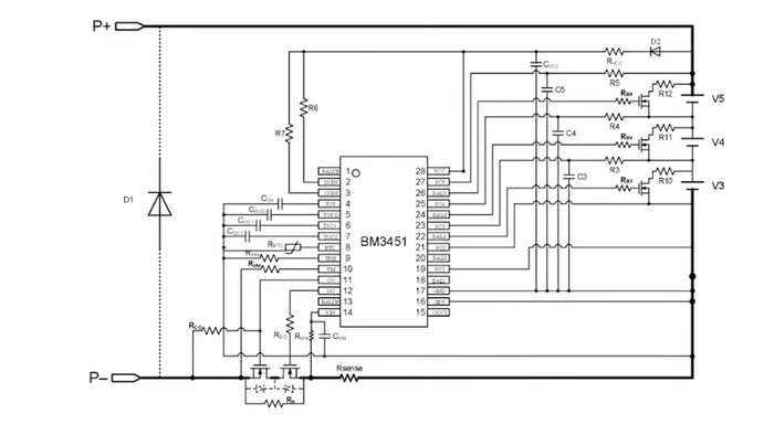 Основной элемент управления — специализированная микросхема BM3451, которая в данном модуле может быть разной в зависимости от типа аккумуляторов, будь то литий-ионные или литий-железо-фосфатные.