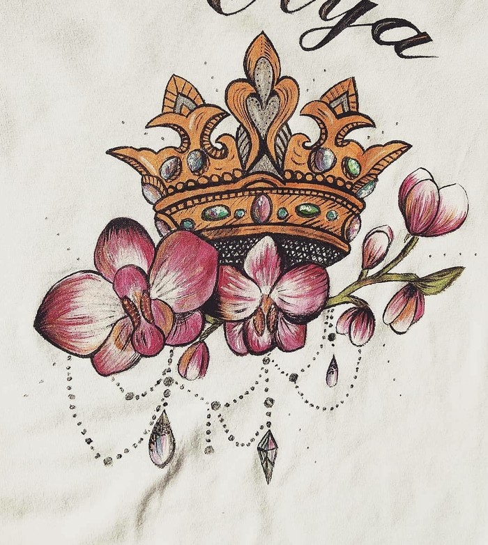 👑Именная роспись футболки 👸🏼как жаль что фото не передаёт всей текстуры и игры красок, при солнечном свете корона сверкает золотыми искрами, словно действительно из золота 🤩