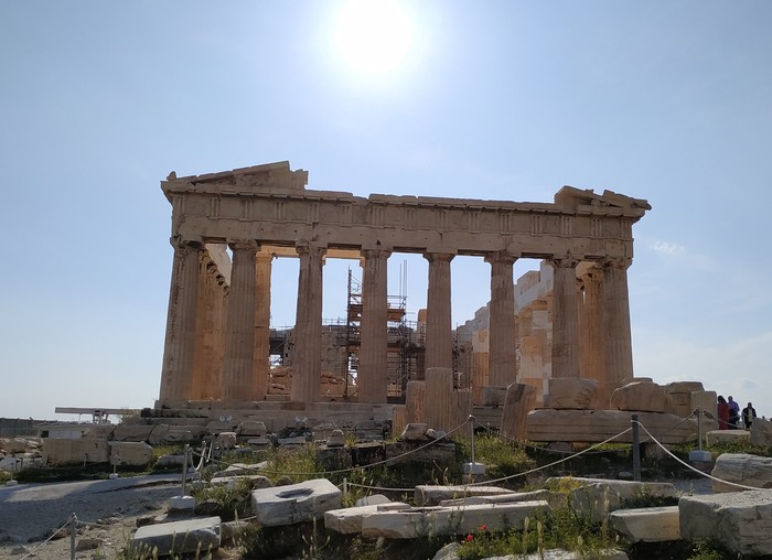 Парфенон. Он уже долгое время восстанавливается, поэтому строительные леса присутствуют постоянно.