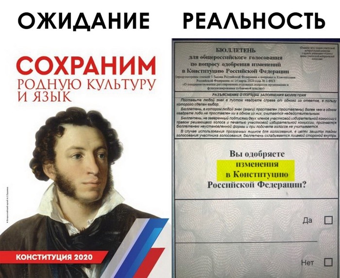 К вопросу о русском языке: Грамотно (нет) составленный вопрос в официальном бюллетене голосования. Правильные варианты: «Вы одобряете изменения в Конституции?» или «Вы одобряете поправки к Конституции?»