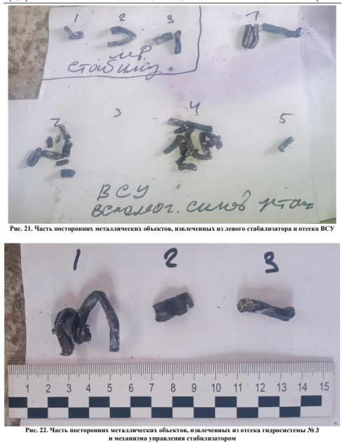 8. Обнаруженные в глухих повреждениях фюзеляжа посторонние объекты, не принадлежащие воздушному судну, были извлечены; их фотографии представлены общественности в тексте предварительного отчета. Для точного определения принадлежности обнаруженных посторонних объектов в дальнейшем планируется проведение дополнительных экспертиз;