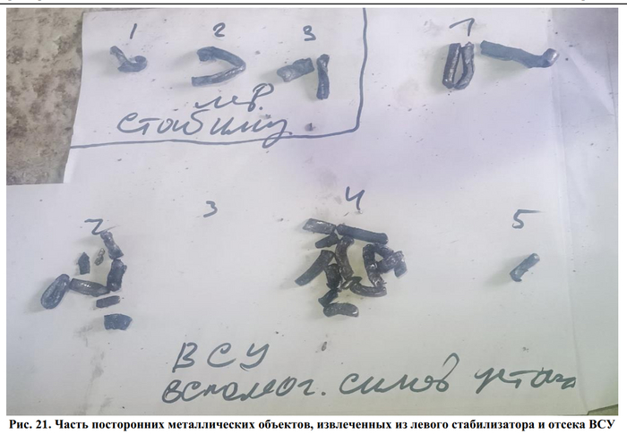 Главное что всех интересует это, наверное, что явилось причиной отверстий в общивке самолета. На фото из отчета именно эти предметы. По их поводу в отчете сказано:
