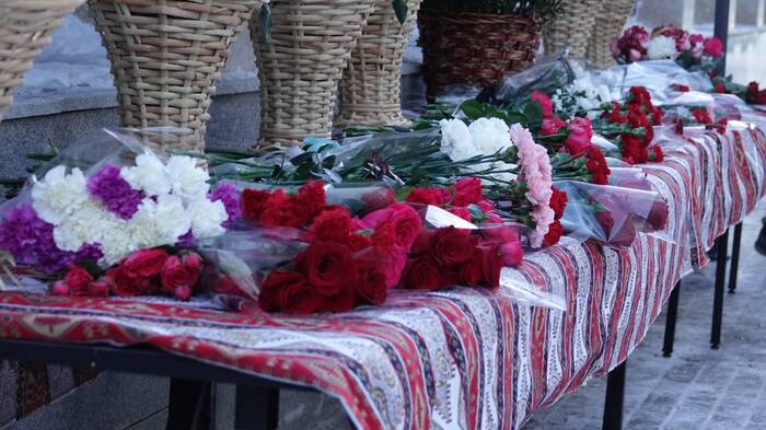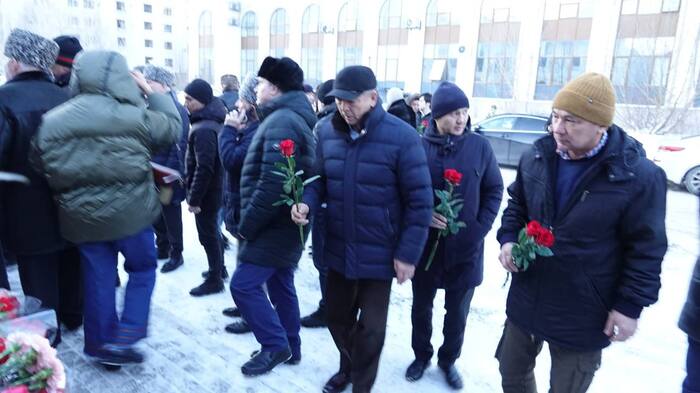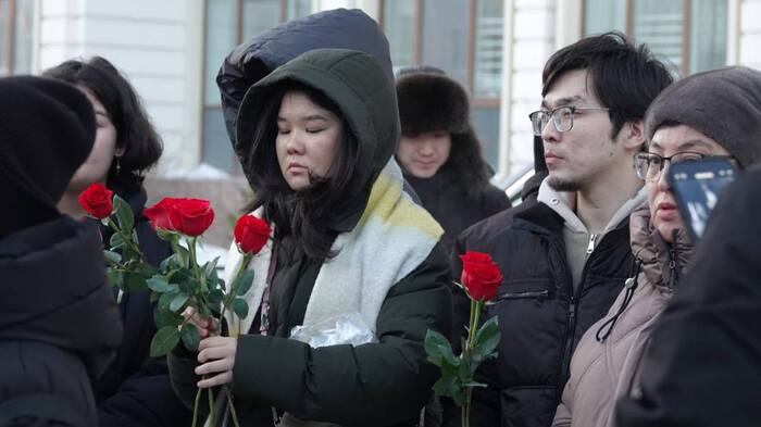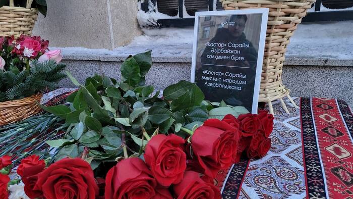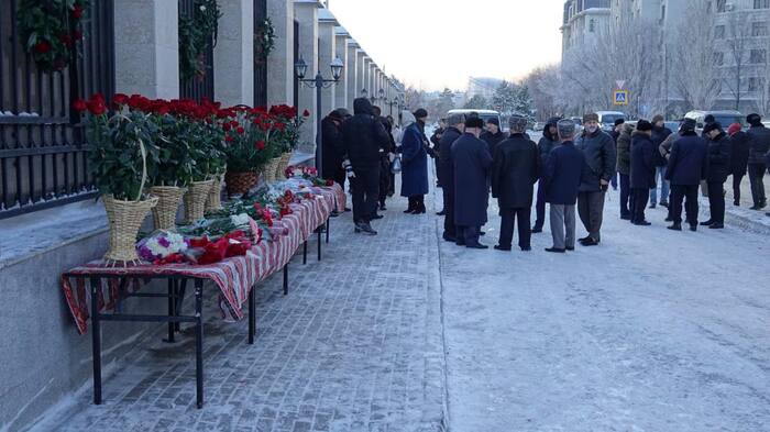 Казахстанцы несут цветы к посольству Азербайджана в Астане