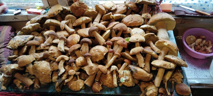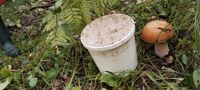 Итог пятичасовой вылазки по грибы. Примерно 8 ведер разных грибов. Здесь и грузди, и подосиновики, и подберезовики, и дождевики. Грузди замочили в ванне, крупные губчатые и дождевики пожарили, крепкие и небольшие губчатые - замариновали.