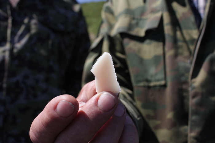 Обломок зуба. Края с зазубринами, как ножовка по металлу, но очень острые.