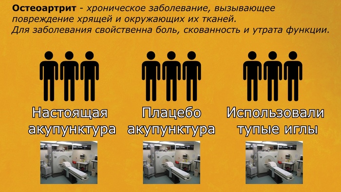 Они собрали людей с болезненным остеоартиротом и разделили на три группы: одним проводили настоящую акупунктуру, вторым плацебо-акупунктуру и третьим нажимали на кожу тупыми иглами.