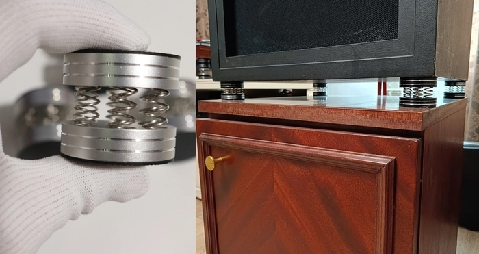 Интересные подпружиненные амортизирующие ножки для различной аудиоаппаратуры: колонки, усилители и прочее. Отлично гасят удары и вибрацию. На выбор комплект из чёрных или серебряных ножек. Ссылка на них