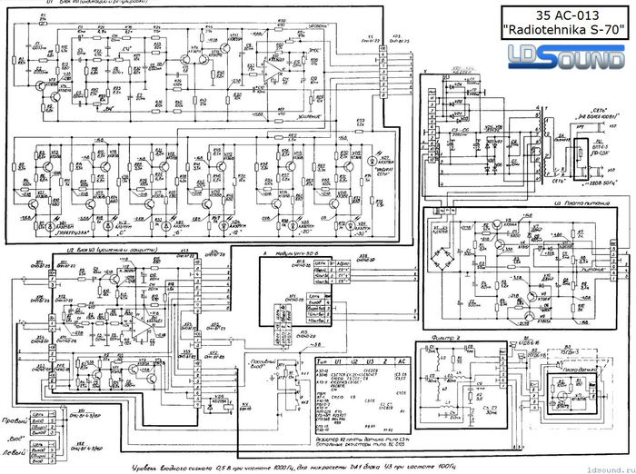 Усилительный тракт «S-70» построен на базе модуля УНЧ-50-8, аналогичного используемому в блоке «Радиотехника У-101». Его номинальная мощность составляет 35 Вт при максимальной отдаче 70 Вт. Схема включает несколько функциональных блоков: