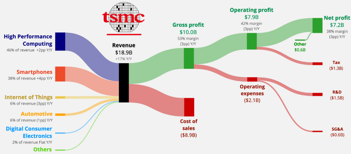 Если убрать геополитику, несмотря на уход основателя TSMC Морриса Чанга, компания продолжает радовать инвесторов - маржа по чистой прибыли 38%!
