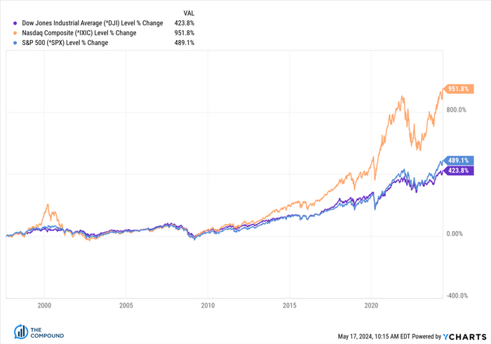 Индекс, впервые созданный в 1896 году, объединяет сильнейшие компании США. Но в нем не доминируют акции технологических компаний с мега-капитализацией. Microsoft — единственная компания из списка Mag 7 https://t.me/TradPhronesis/202. В него входят старые и добрые Caterpillar, Home Depot, McDonald's и American Express..