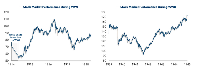 DJ один из старейший фондовых индексов. Если посмотреть на индекс Доу Джонс (промышленный) в период 1 и 2-й мировых войн. И там и там он был в плюсе..., но скромном. Ралли начнется после. США заработает на экспорте в пораженные войной регионы мира.