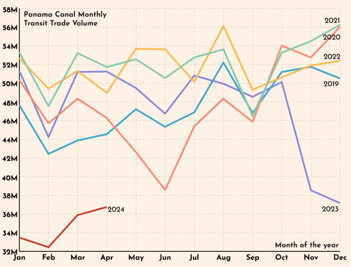 Через Панамский канал проходит 12% торговли США на сумму почти 2 триллиона долларов. Сильная засуха в Панаме и низкий уровень воды ограничил пропускную способность канала для судов на 30%, что может привести к огромным перебоям в цепочках поставок.