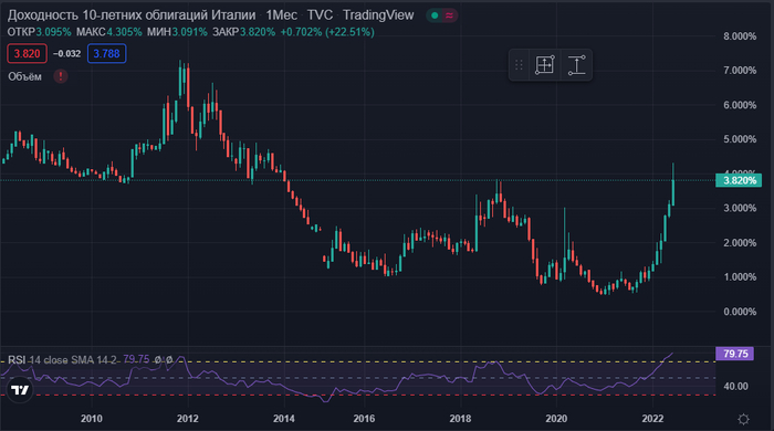 Купонные ставки по облигациям Италии и Греции взмыли вверх, оторвавшись от соответствующих показателей остальных государств Европы. Ситуация напоминает долговой кризис десятилетней давности, когда европейский финансовый сектор спасли только экстренные меры (покупкой Евробондов проблемных стран и три пакета помощи Греции). Сейчас такая возможность отсутствует из-за необходимости параллельно сдерживать разгоняющуюся инфляцию. ЕЦБ прийдётся выбирать между инфляцией и долговым кризисом стран. А теперь перейдём к причинам такого резкого скачка.