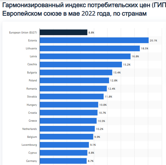 Получается, что с июля ставка повышается, а вливание денег прекращается. Италия не сможет обслужить свой долг и по сути это приведёт в будущем к рецессии в Европе. Если всё же продолжить QE, то это приведёт к разгону инфляции и Европа также впадёт в рецессию. Почему же инфляция ускорилась и заставила ЕЦБ повысить ставку впервые за 11 лет?